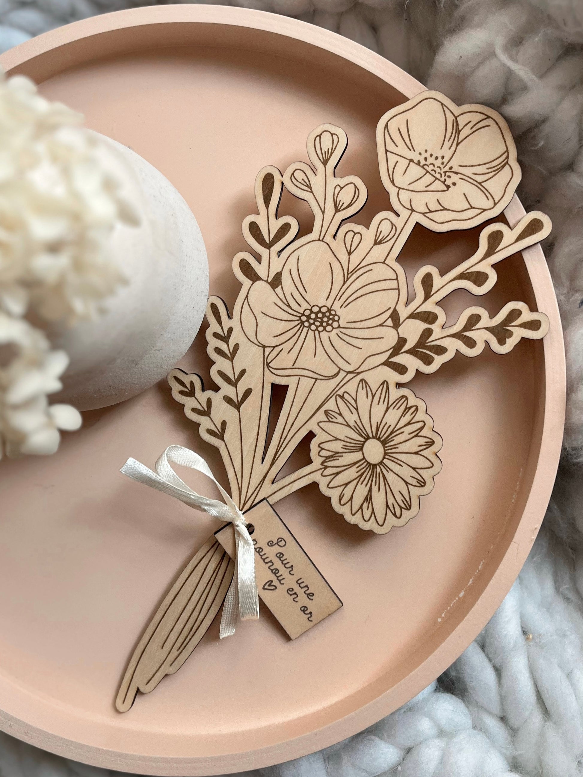 Dites merci avec un bouquet qui ne fanera jamais ! Ce bouquet de fleurs en bois gravé "Nounou en or" est une attention originale et pleine de tendresse pour remercier la nounou de votre enfant. Chaque fleur en bois naturel est découpée et gravée avec soin, pour créer un souvenir décoratif qui durera dans le temps.