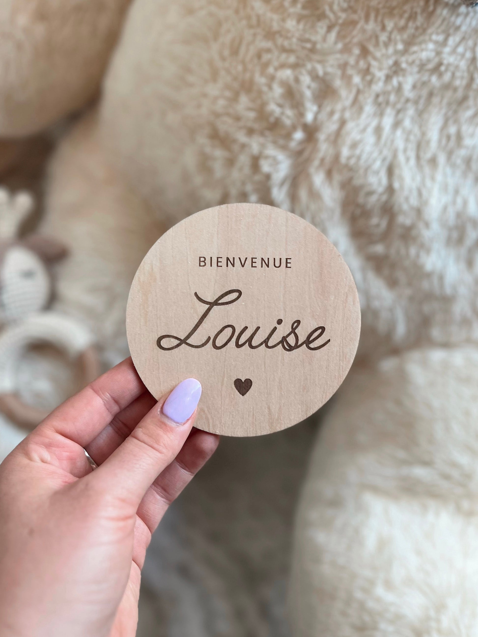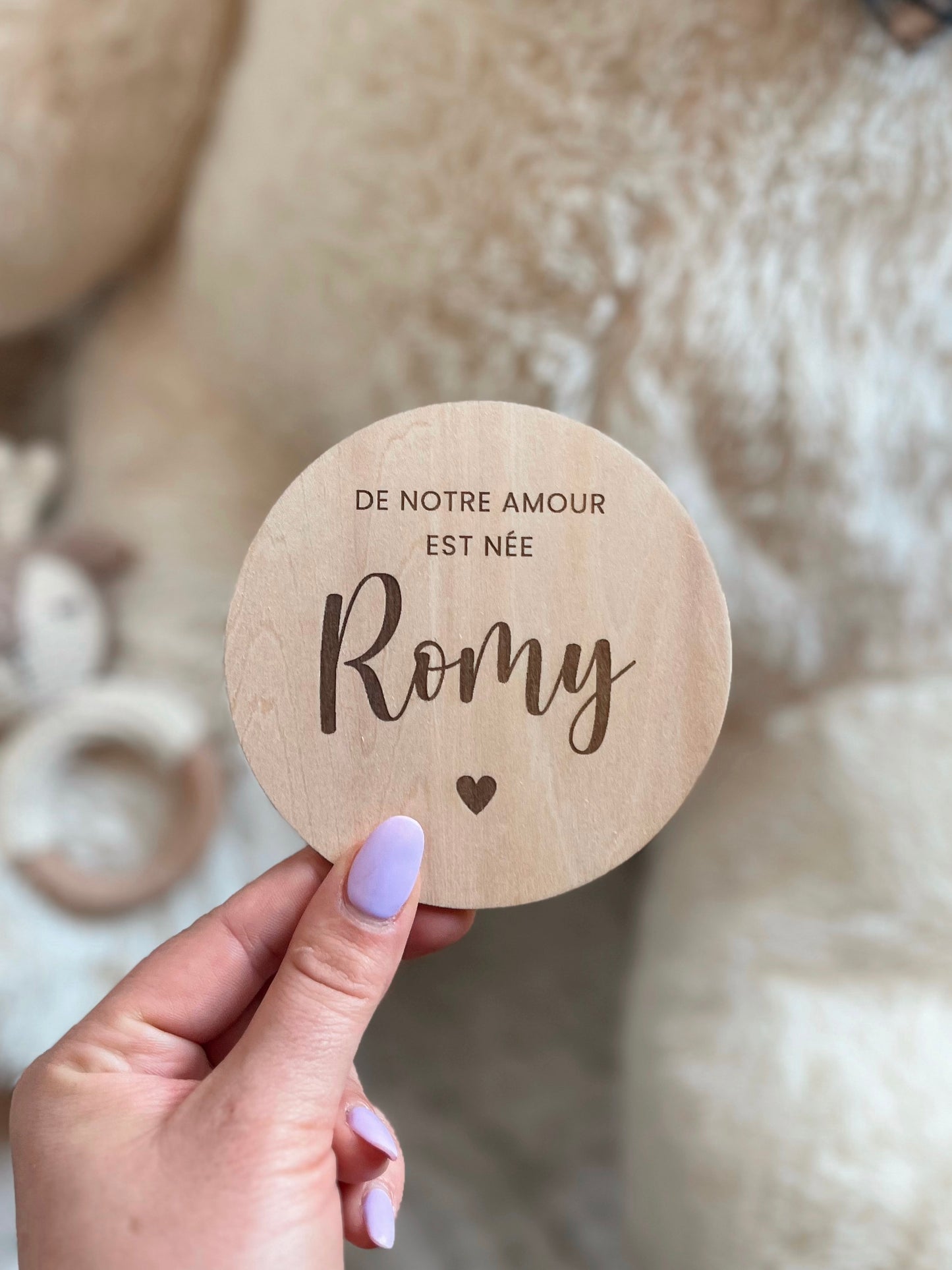 - Personnalisation : prénom de l'enfant, texte au choix entre bienvenue, de notre amour est né(e) et d'un grand amour est né(e)