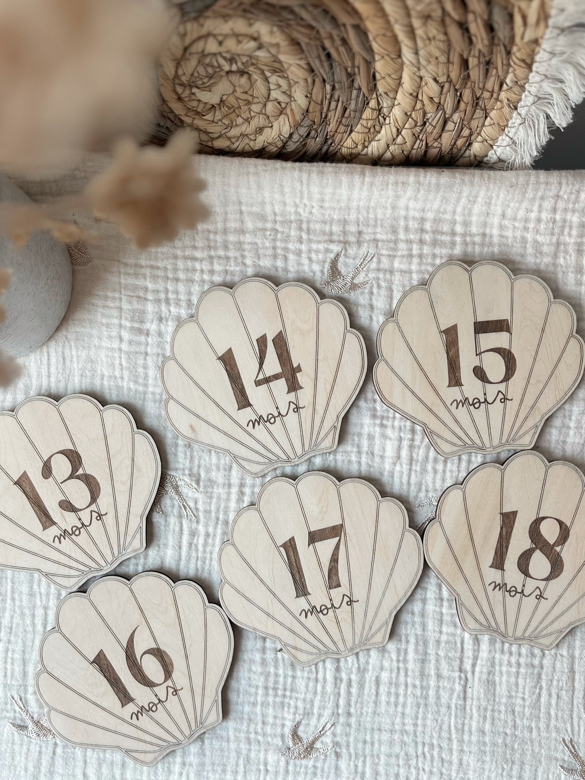 Les premières années d'un enfant sont précieuses, remplies de découvertes et de petits instants inoubliables. Avec ces cartes étapes en bois gravées en forme de coquillage, capturez chaque mois sa croissance et ses progrès pour garder une trace de ces instants qui filent trop vite.
