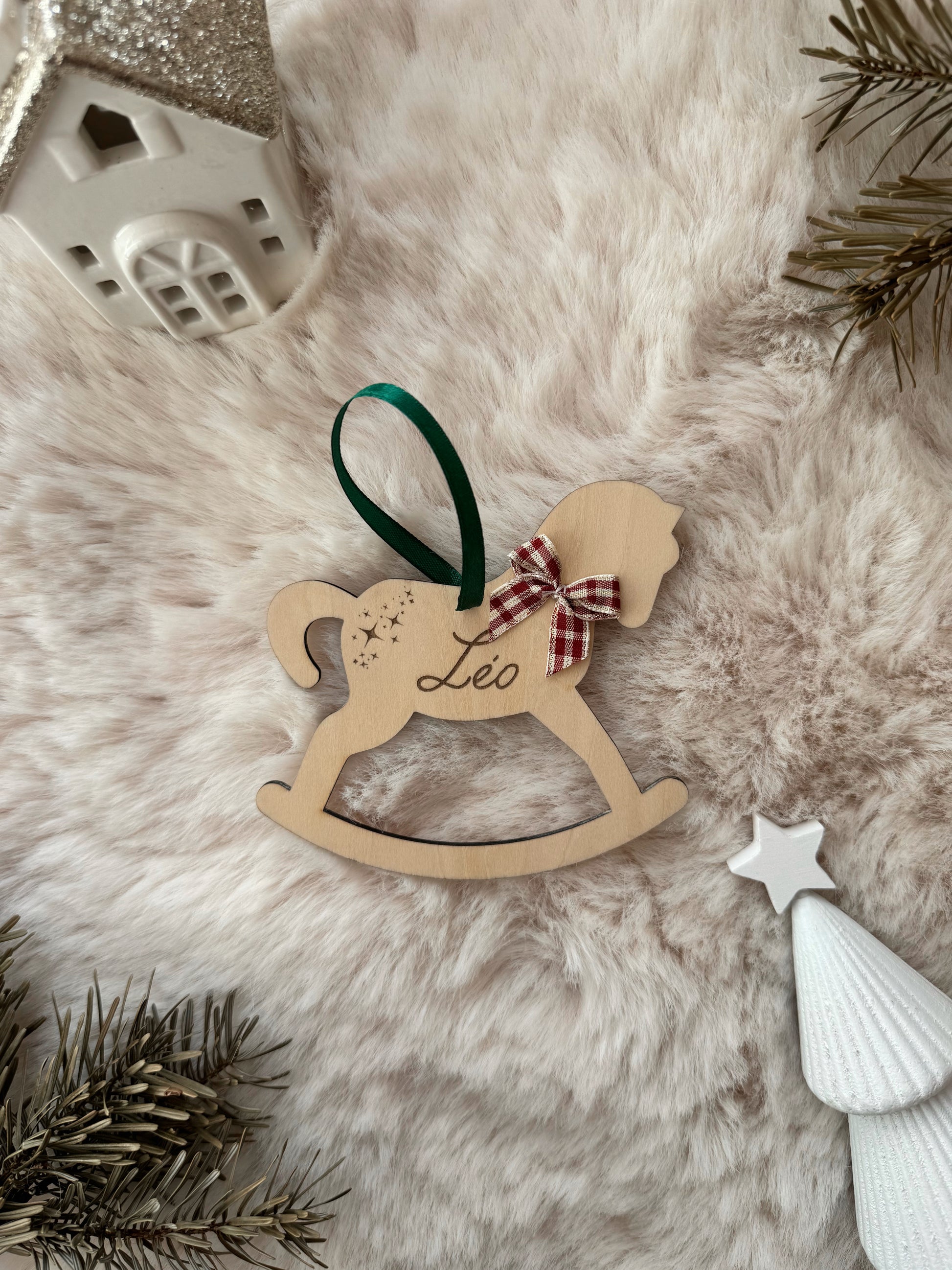Décorez votre sapin avec ce cheval à bascule en bois, personnalisé au prénom de votre choix. Chaque détail, du ruban vert sapin au petit nœud vichy rouge et doré, apporte une touche. Léger et élégant, il se glisse dans les branches pour créer un Noël authentique qui restera un souvenir précieux année après année.