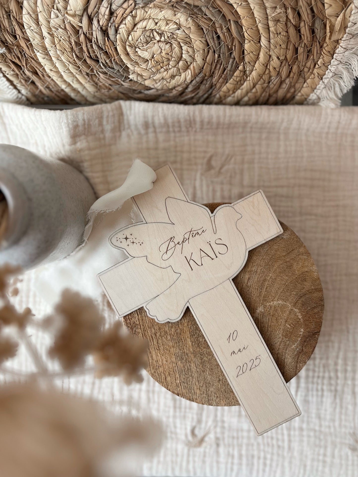 Symbole de foi et de bénédiction, cette croix en bois gravée est bien plus qu'une décoration : elle incarne la douceur et la spiritualité du baptême de votre enfant. Personnalisée avec son prénom et la date de cette journée sacrée, elle devient un précieux témoignage de cet instant de grâce.