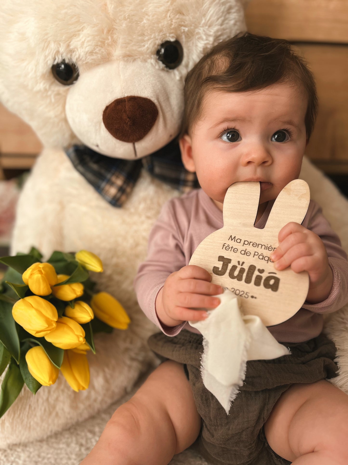 Immortalisez la première fête de Pâques de votre bébé avec cette jolie pancarte personnalisée en forme de lapin. Le ruban en mousseline de soie vient apporter une touche d'élégance à la création.