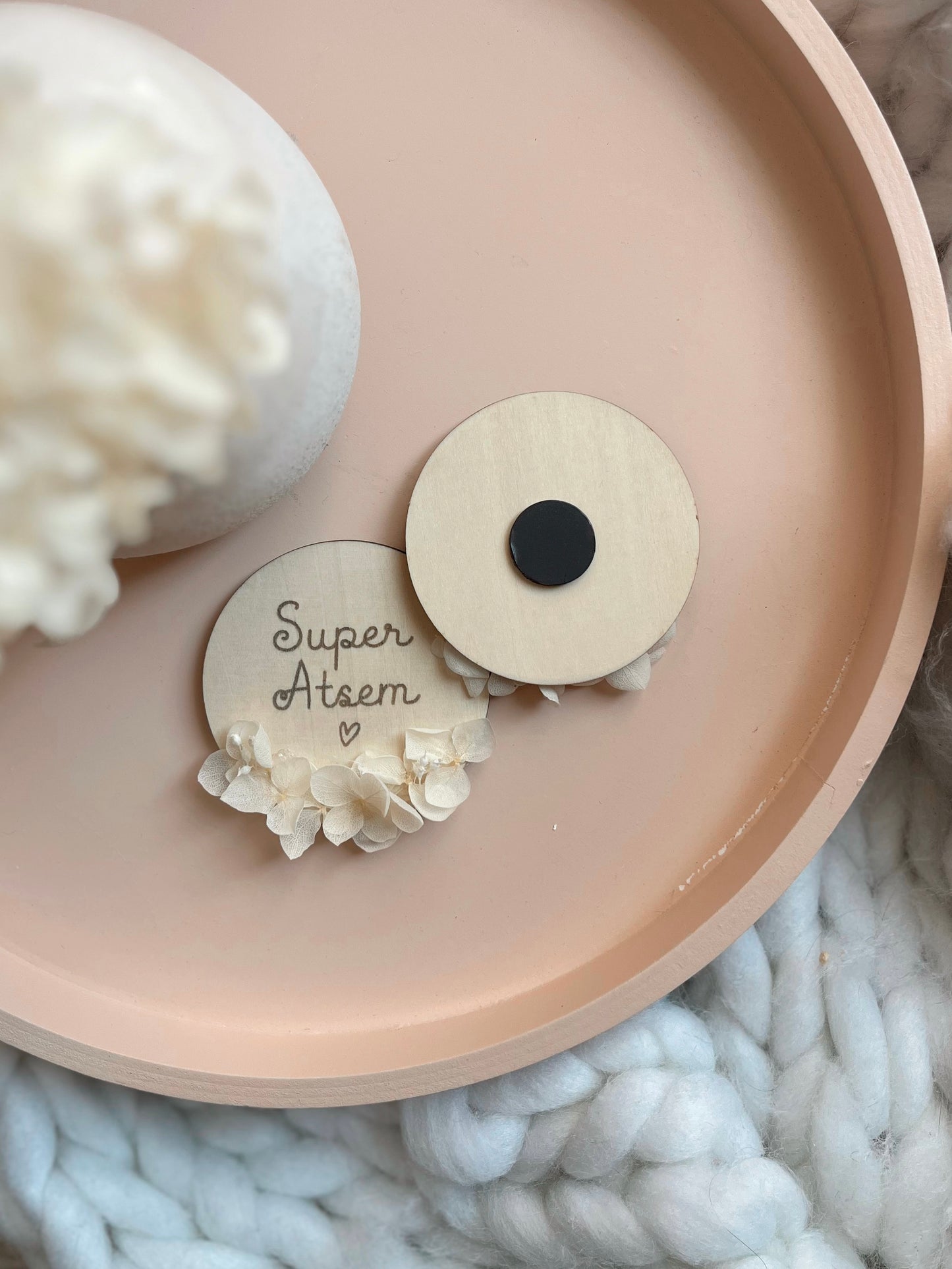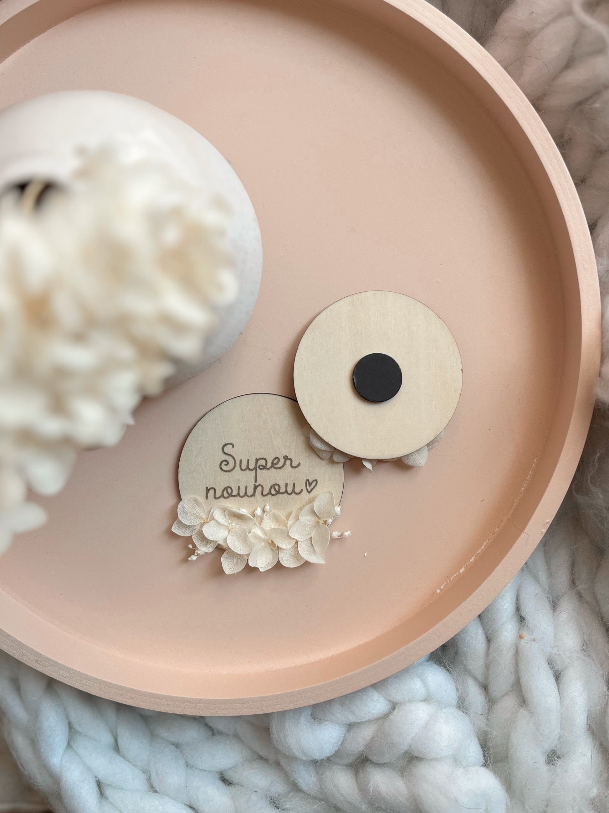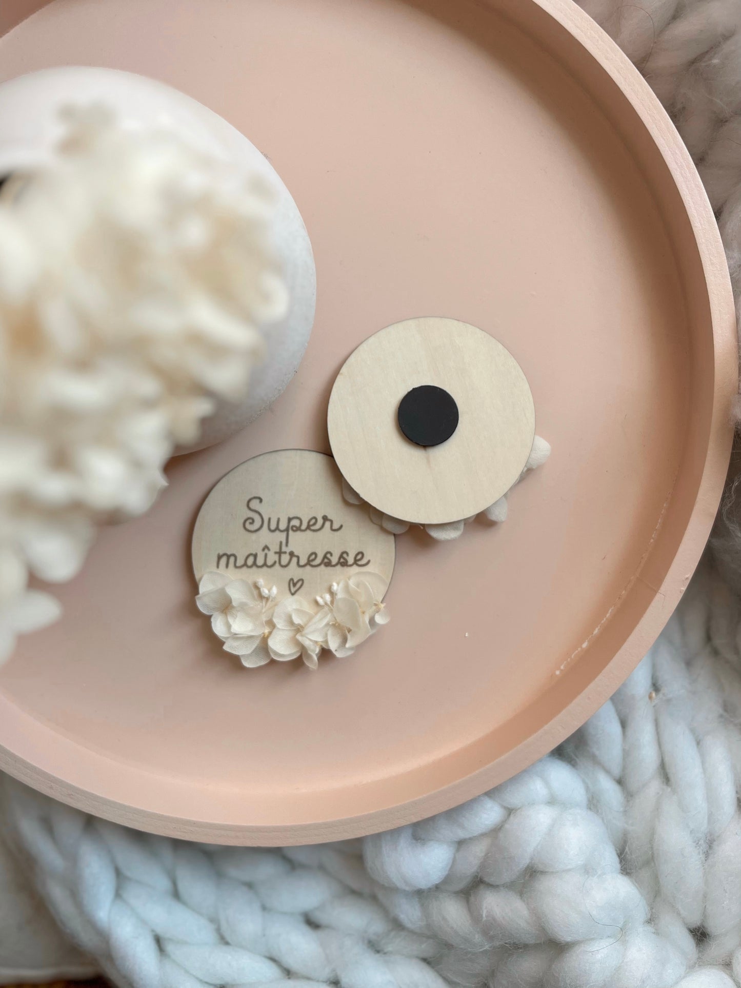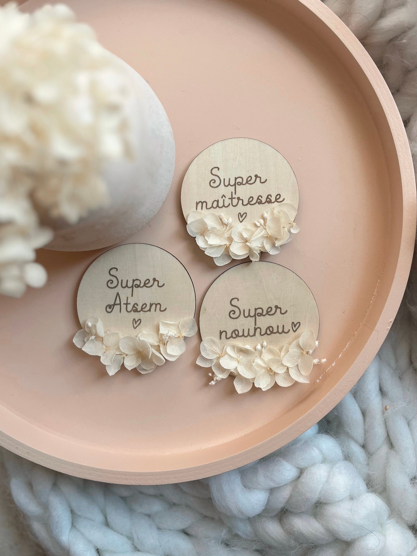 Un petit mot gravé, un grand merci à offrir ! Ce magnet en bois naturel, délicatement orné de fleurs séchées (hortensias blancs et broom bloom), est le cadeau idéal pour remercier une super maîtresse, une nounou attentionnée ou une ATSEM formidable. À la fois sobre, tendre et raffiné, il fera fondre le cœur de celle qui le recevra.