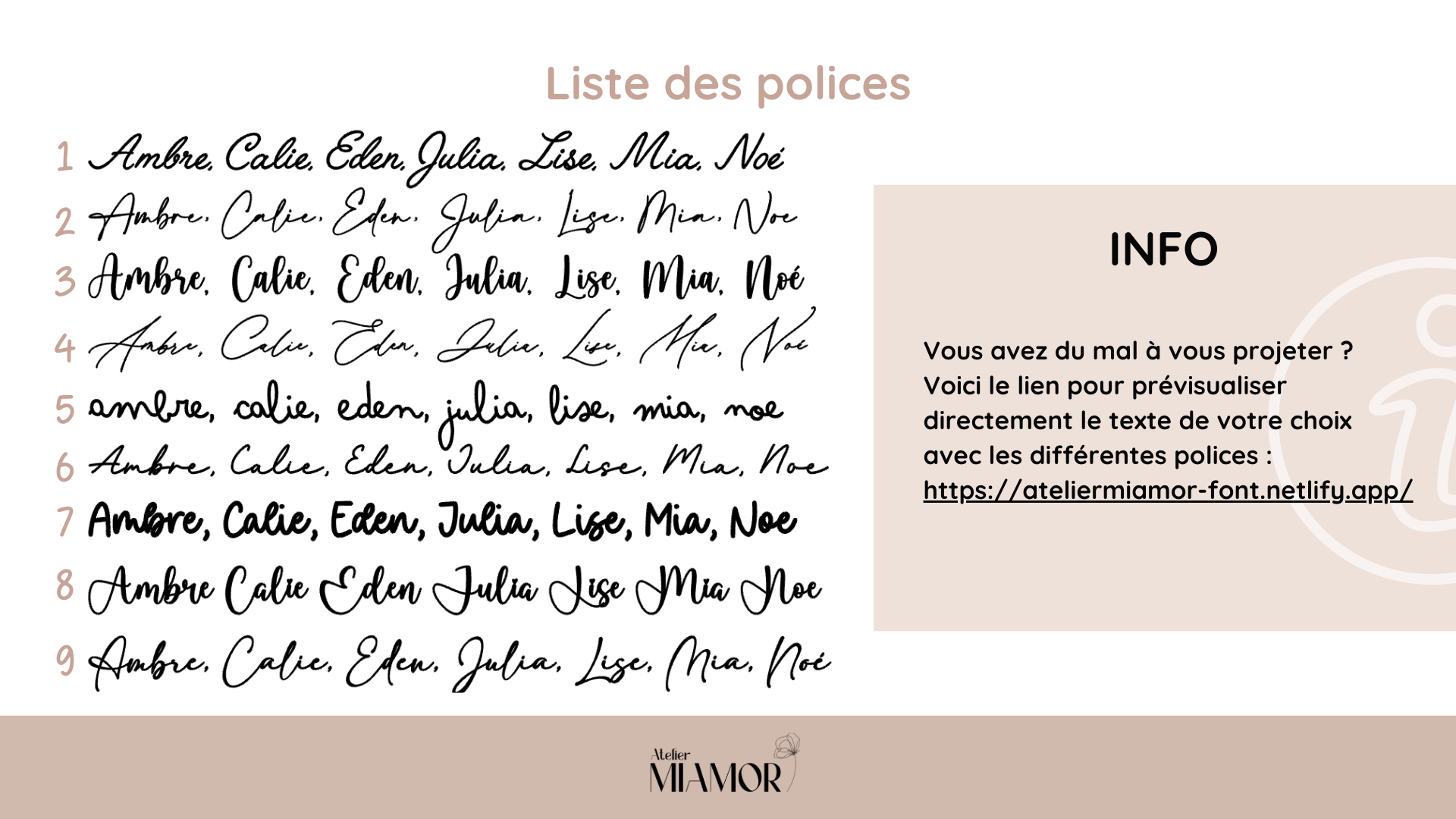 - Pour prévisualiser votre texte avec les différentes polices proposées, c'est ici : https://ateliermiamor-font.