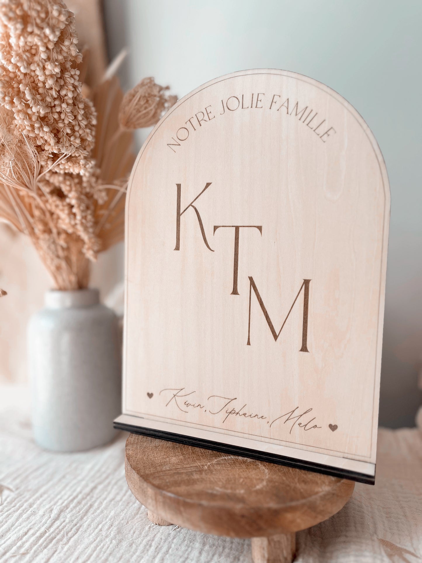 Ce panneau en bois gravé célèbre votre famille à travers un jeu élégant d'initiales entrelacées, symbole du lien profond et indissociable qui vous unit. Chaque prénom y est gravé avec délicatesse, rendant cet objet unique.