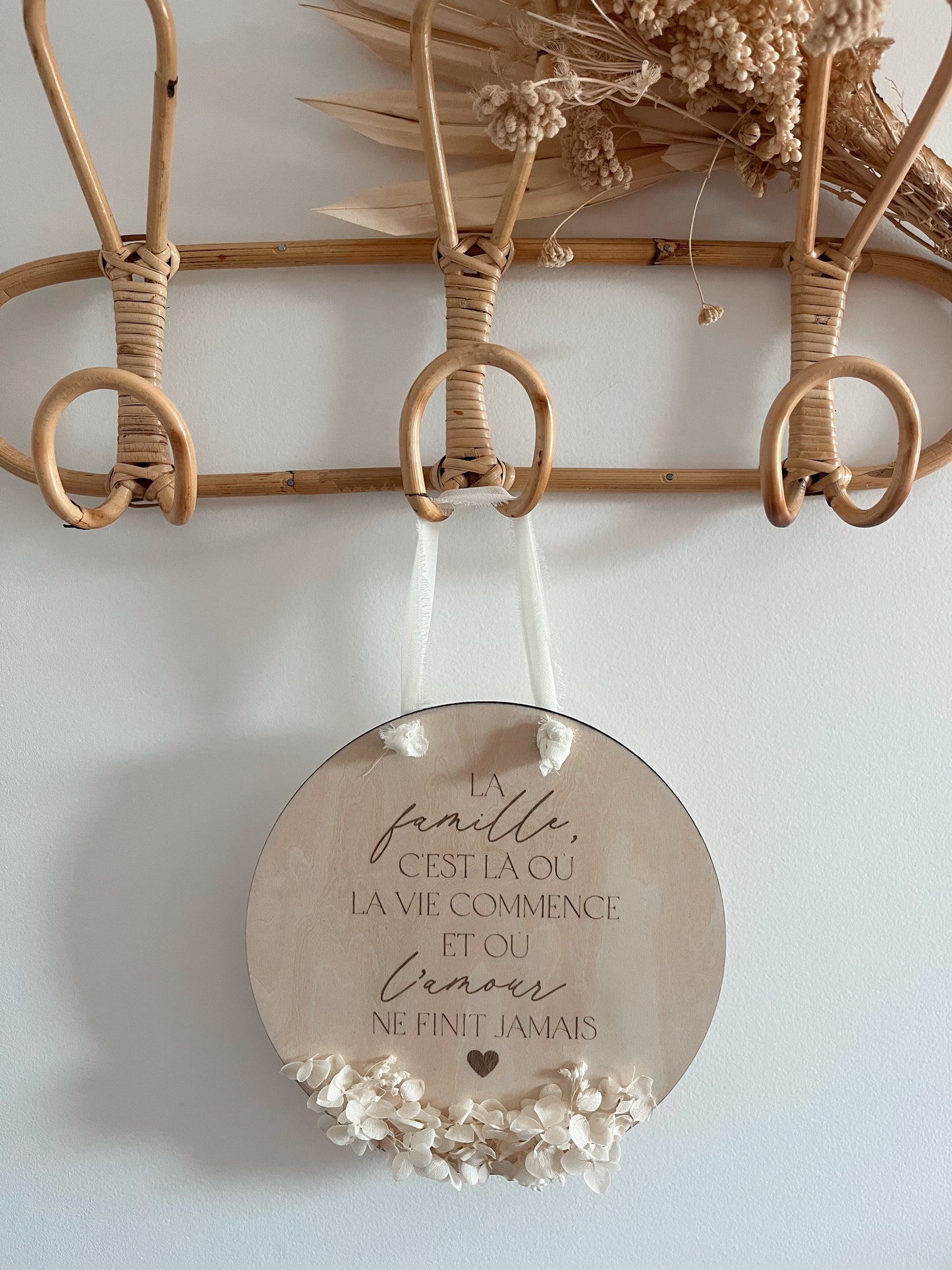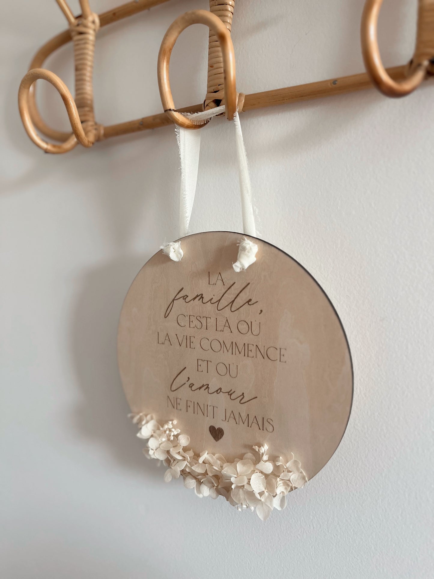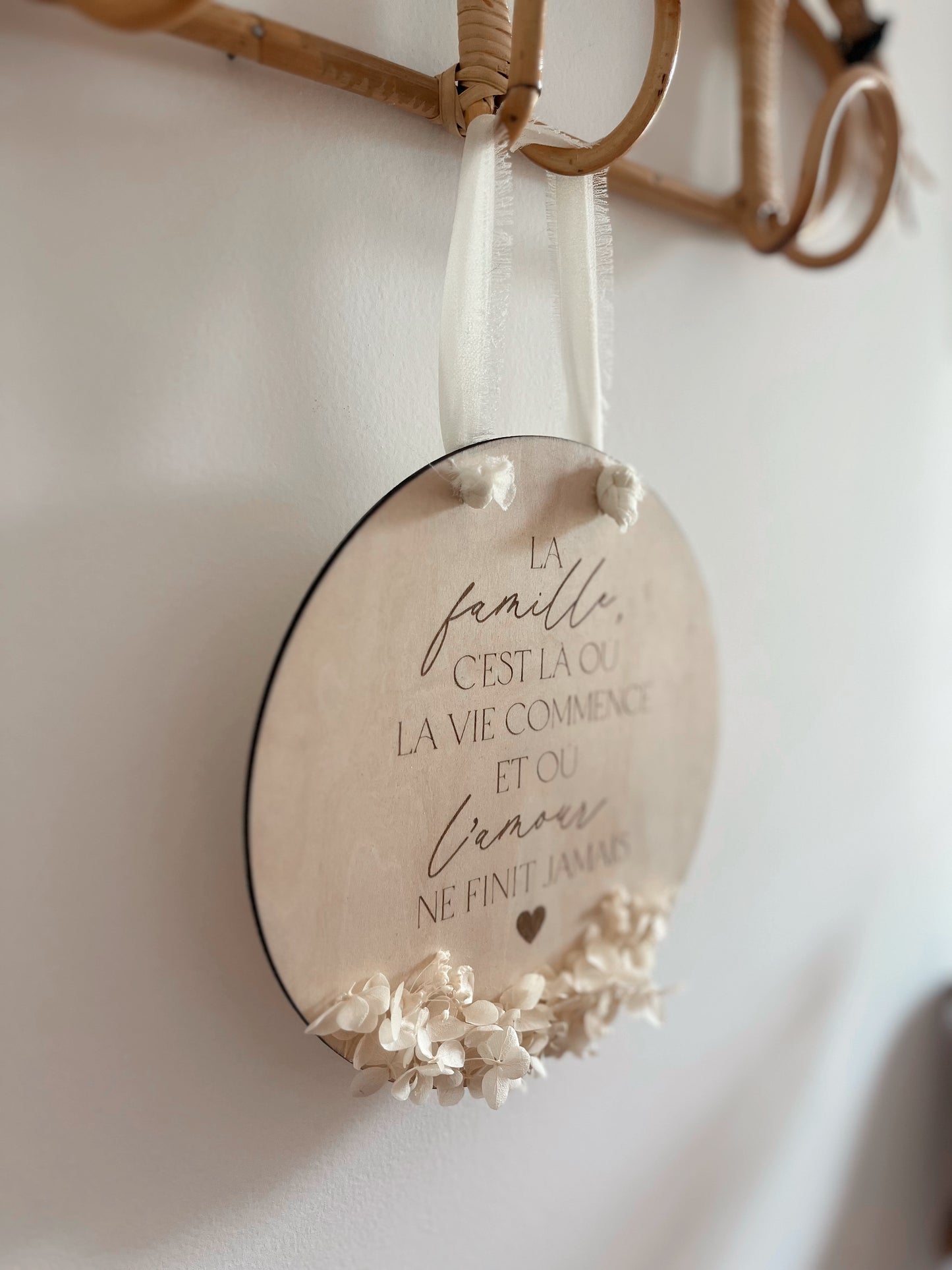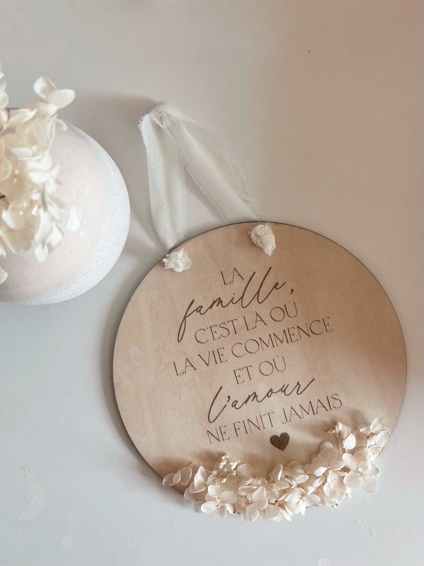 Laissez parler votre cœur avec cette pancarte décorative en bois, subtilement ornée de vrais hortensias blancs stabilisés, pour une touche florale éternelle. Gravée de la phrase « La famille, c’est là où la vie commence et où l’amour ne finit jamais », elle incarne à merveille l’émotion des liens qui nous unissent.