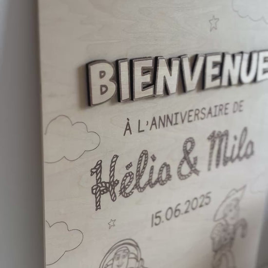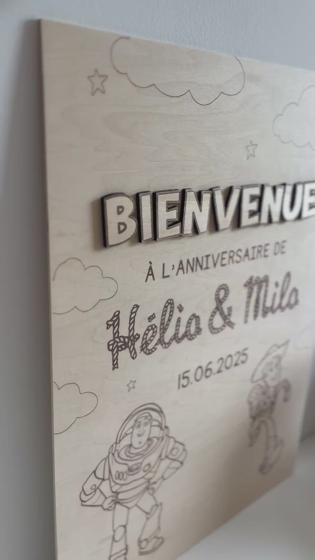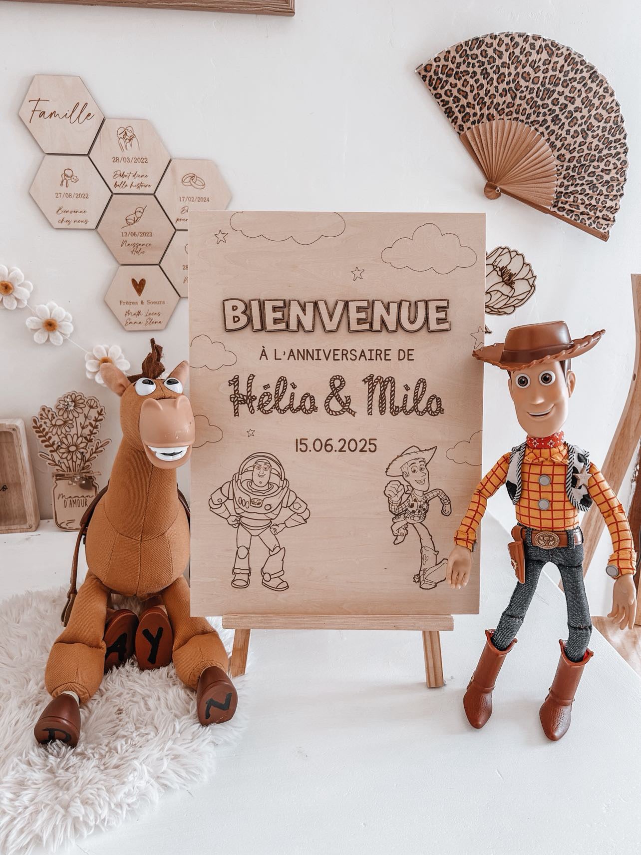 Avec Woody et Buzz l’Éclair en vedettes, ce panneau en bois personnalisé accueille petits et grands pour une fête d’anniversaire pleine d’aventures ! Une déco fun et originale, à garder en souvenir d’un jour magique.