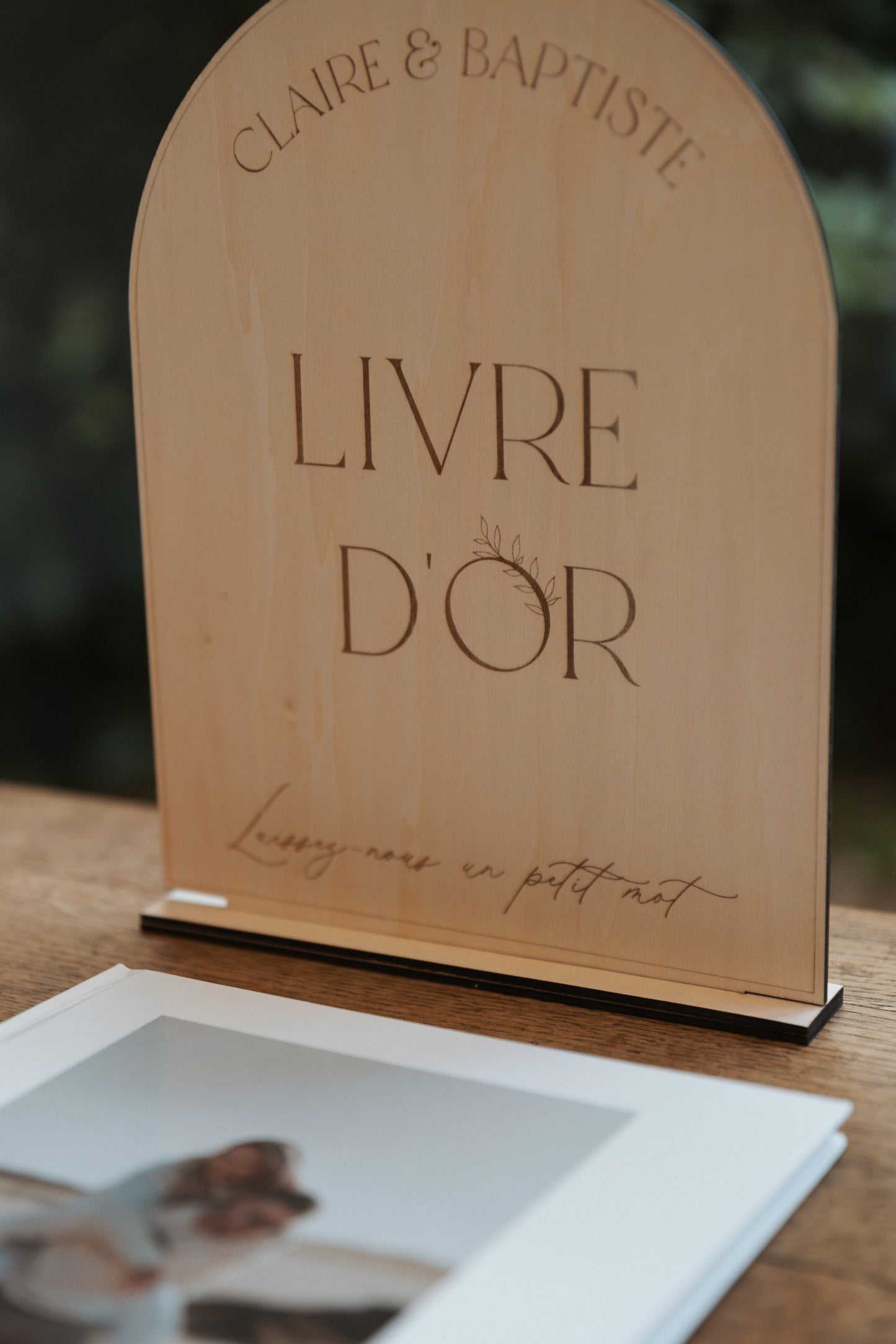 Parce que les plus beaux souvenirs sont ceux que l'on écrit, invitez vos proches à écrire leurs vœux et anecdotes avec ce panneau livre d'or personnalisé en bois gravé. Parfait pour guider vos invités vers le livre d'or, il apporte une touche élégante et personnalisée à votre décoration.