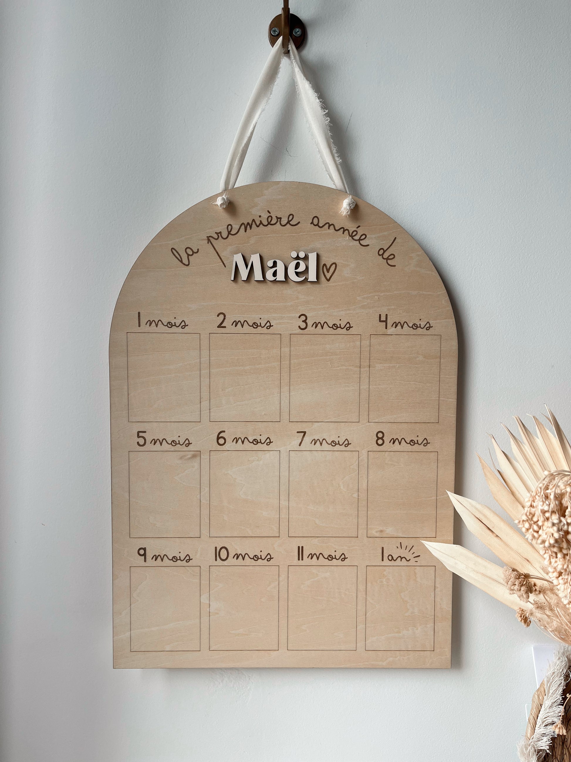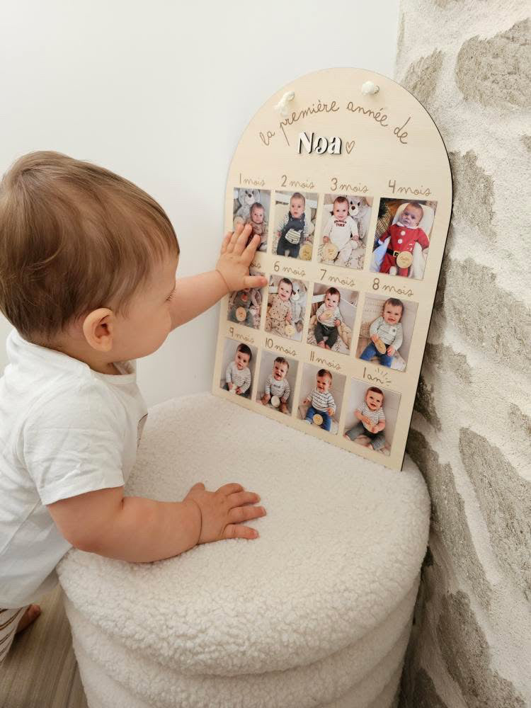 Gravé de "1 mois" à "1 an", ce panneau comprend 12 emplacements pour glisser vos plus belles photos (format 6 x 7 cm), retraçant mois après mois l’évolution de votre petit trésor. Tout en haut, la phrase "La première année de" est délicatement gravée, accompagnée du prénom de l’enfant en relief.