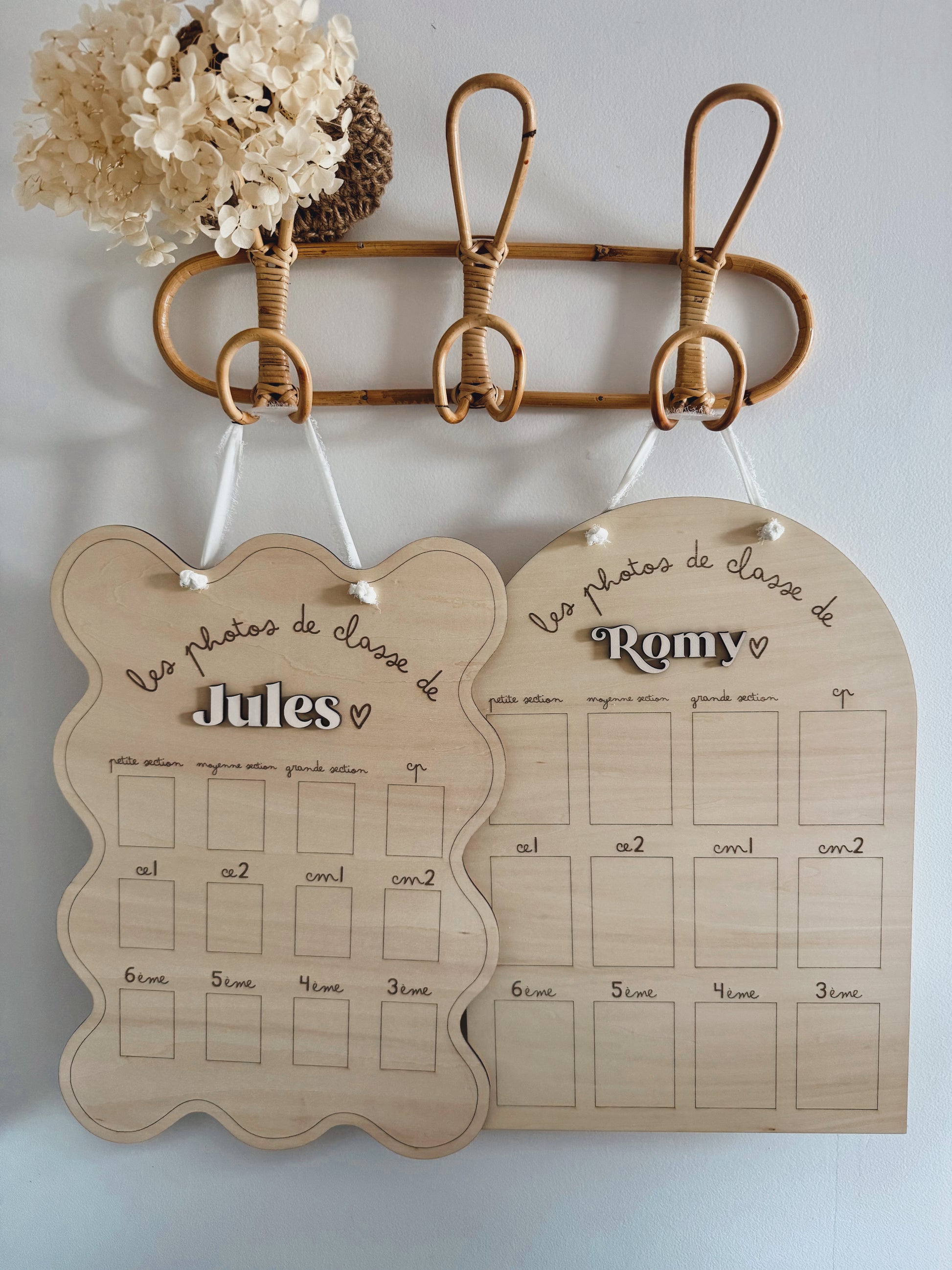 Capturez chaque année scolaire avec ce panneau photo de classe en bois personnalisé. Il suffit de coller les photos individuelles de vos enfants pour créer un souvenir unique et évolutif. Le prénom en relief apporte une touche originale et élégante à cette décoration durable, parfaite pour suivre la croissance et les visages d’année en année. Idéal comme cadeau souvenir d’école ou décoration de chambre d’enfant.