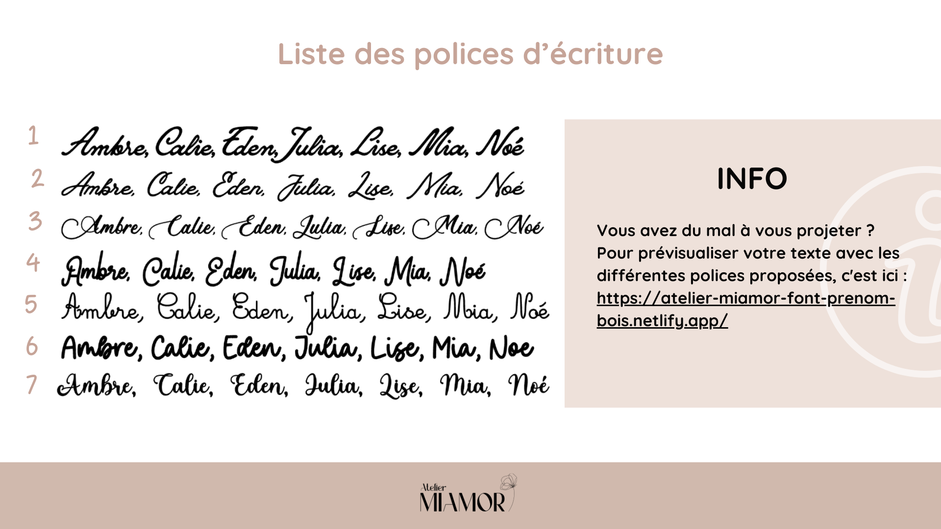 - Pour prévisualiser votre texte avec les différentes polices proposées, c'est ici : https://atelier-miamor-font-prenom-bois.netlify.app/