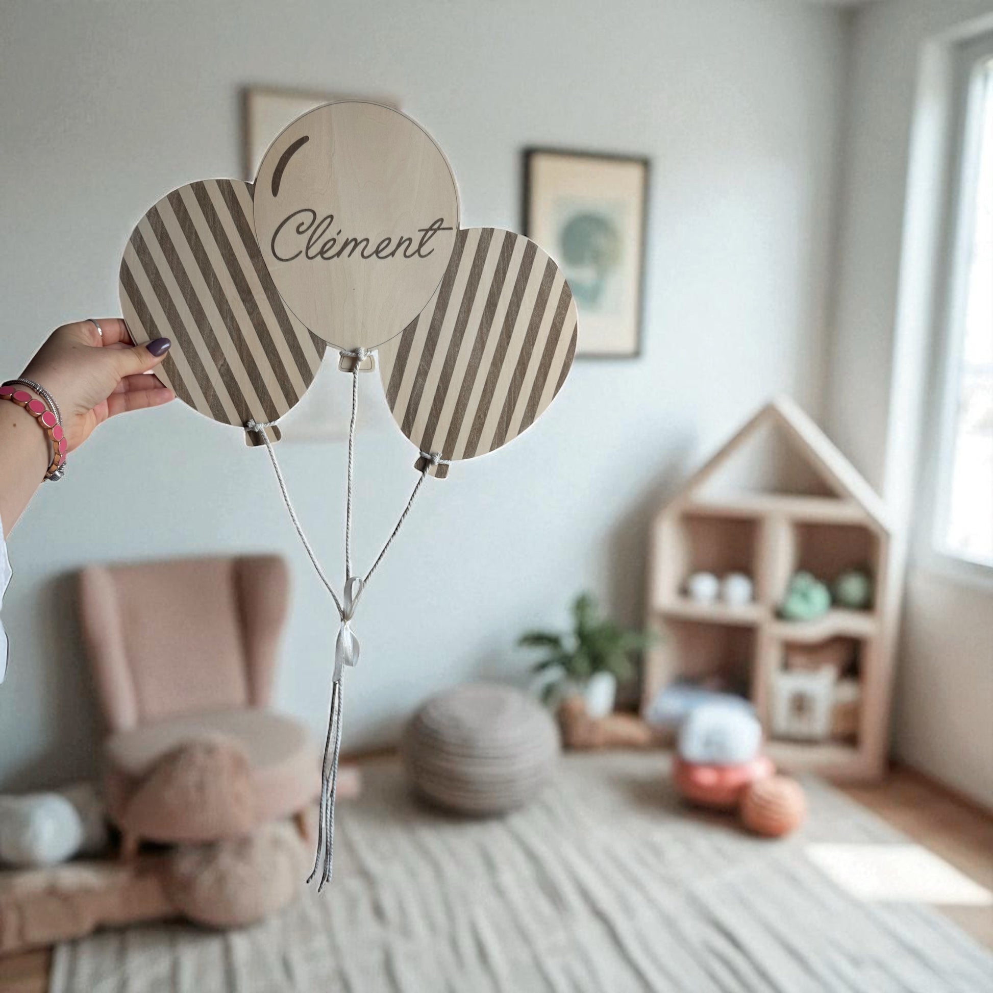 Apportez une touche de douceur dans une chambre d'enfant avec cette décoration murale en bois gravé en forme de ballons et son indémodable motif rayures.